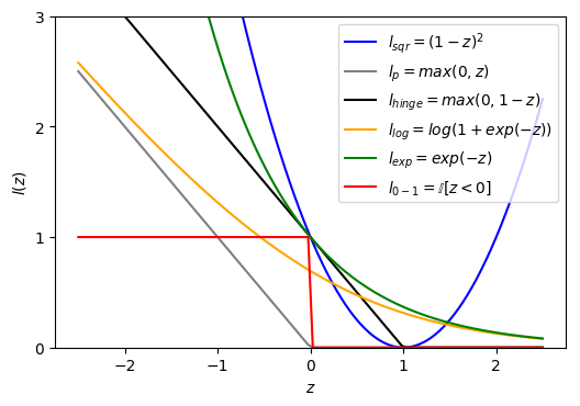 如果我们统一考虑正、负样本,令$z=s(\mathbf x)*y$ ,那么分类正确时,$z$必然始终为正值,不妨称其为绝对评分值,$z$是对分类是否正确的一个度量。则$l_{0-1}=\mathbb{I}[sign(z)= -1]$,故$l_{0-1}$是关于$z$的分段函数。从最优化理论的角度来看,这个函数无法求梯度或次梯度 ,因此需要找它的近似来优化。这个近似$\widetilde l$的基本标准是:始终为非负值;当它很小时,$l_{0-1}$很小。